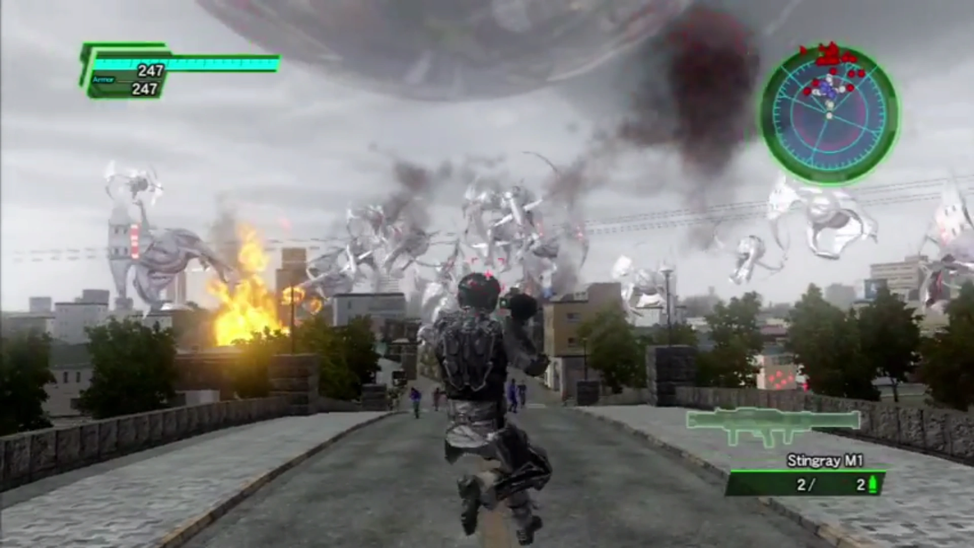 Notably, "do absolutely nothing" is actually a serviceable strategy in this mission since the powerful EDF NPCs will eventually beat it by themselves, even on Inferno. Moving back into the city to avoid Flying Drones that detach themselves from the main group will result in all of them engaging the rocket launcher and sniper teams down by the bridge, who will proceed to wreck them and generate a big pile of crates in their immediate vicinity.