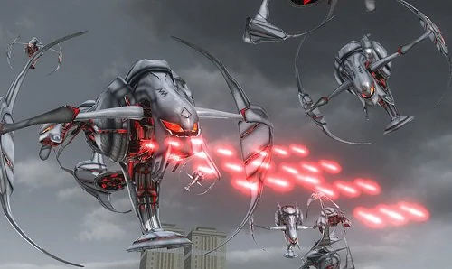 The gleaming chrome-silver Flying Drone is the basic Ravager aerial unit, first seen in mission 10: The Return where they are deployed from the Mothership over Japan. Elsewhere in the campaign they are deployed from Quadruped Fortresses and Large Transport Ships, and are often seen accompanying regular Transport Ships. Later a new and deadlier Ravager aircraft, the Flight Vehicle, is introduced and becomes far more common later in the game, but the Drones continue to operate alongside them.