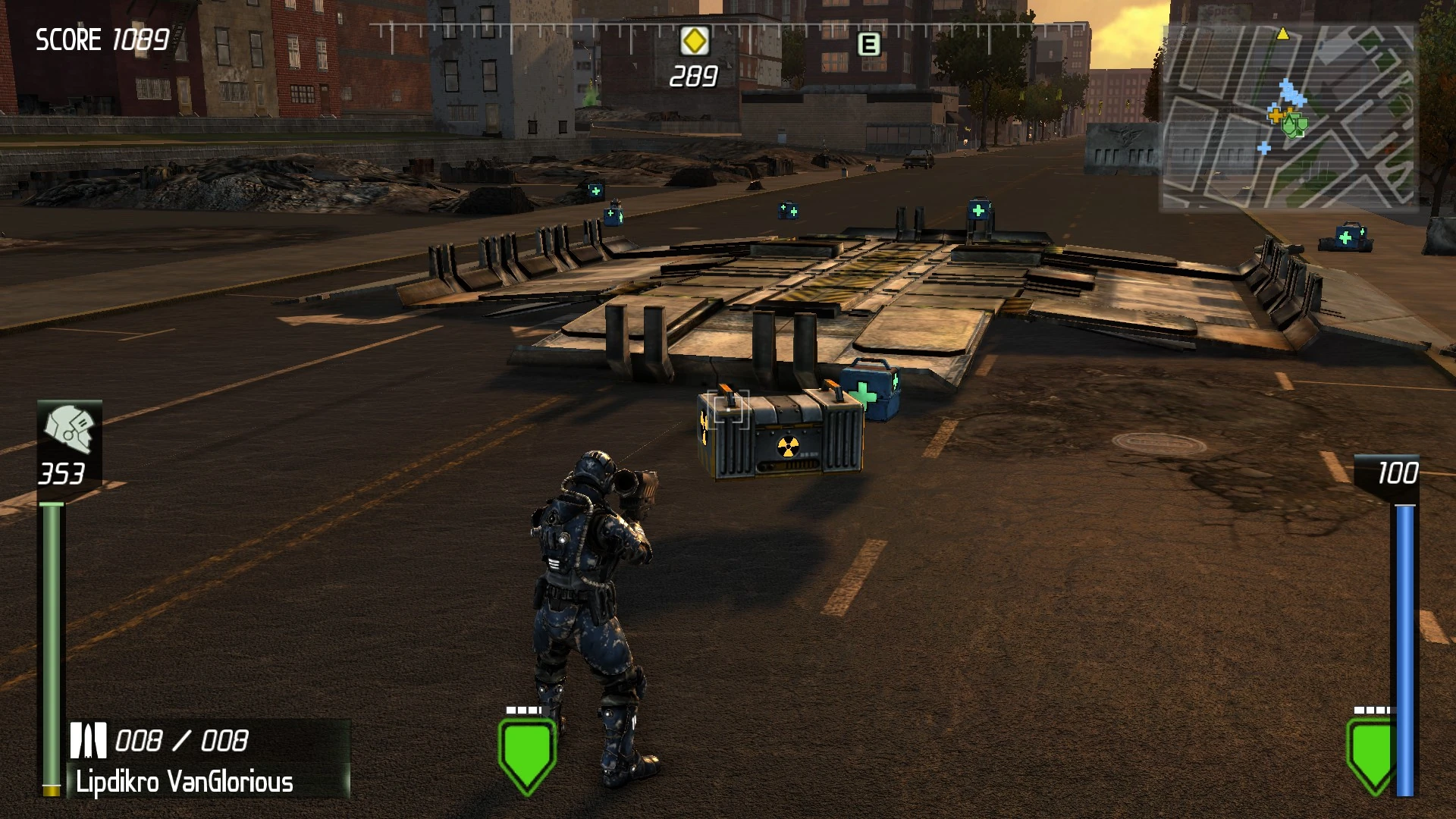 Indicated by a blue cross icon on the minimap, these bluish cube-shaped cases restore a quantity of the player's health. If one player picks up a health pack, all characters below full health will gain the same amount of health up to full health. "Overcharging" the bar to gain armor does not work like this: only the character who who picks up the item will gain any armor, though other characters will still gain health if theirs is less than full. If a character has full health and armor, picking up one of these items is still possible, but does nothing.