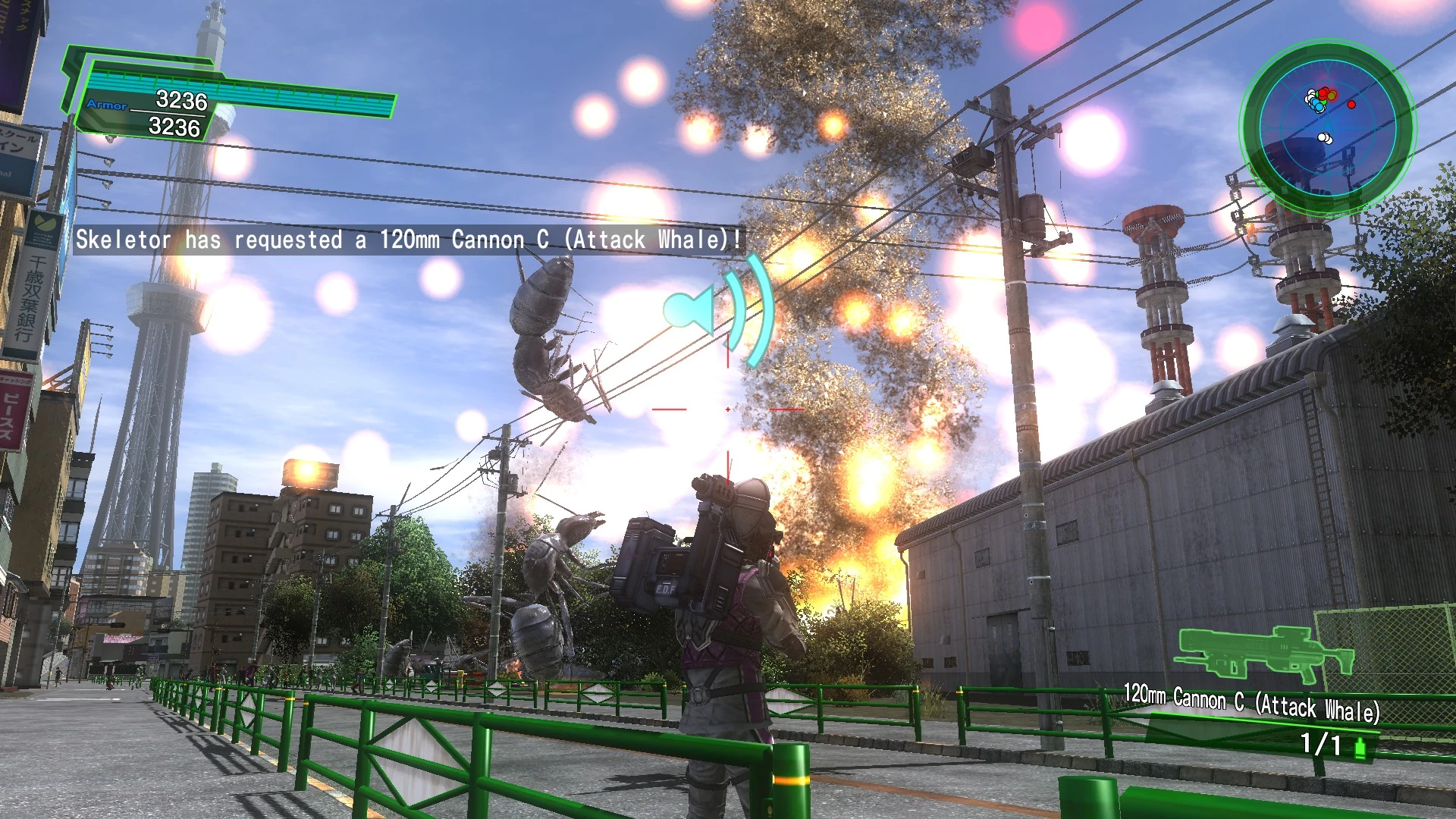 Whale is rarely seen firing in scripted events, since the EDF tends to prefer to use Charon for such things. In 2025 it fires multiple 150mm Cannon shots at the beginning of Brute Force, though these strikes are removed in 4.1, presumably because the mission's added NPC E551 Gigantus and E651 Titan tanks provide enough supporting fire already. It also attacks a group of Deroys with its 120mm cannon at the end of Mountains Ablaze.